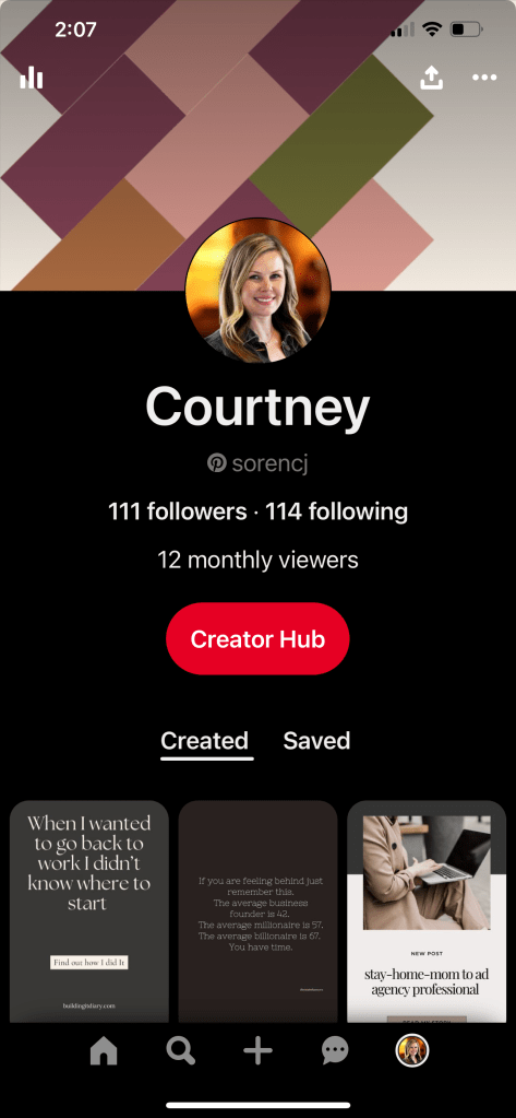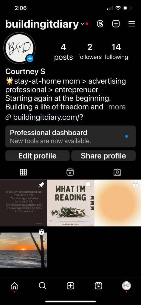 I need to get traffic to this blog, and I want to find a small community that can really find my content valuable. I’ve set up Pinterest and Instagram for buildingitdiary.com so far. You might think that Pinterest is an interesting choice to start with, but I have follow a mentor online, Jenna Kutcher, and she swears by Pinterest. Is it okay if your mentor is 10 years younger than you? I’m not gonna sit with that one too long! I find myself drawn to Pinterest as well because I don’t necessarily want to be this spokesperson or a brand personality. I like smaller groups, intimate settings and deeper connections. I’m not the best candidate for an influencer because I just value integrity and authenticity too much. And by saying that I don’t mean that Tik Tok famous people aren’t authentic, I just don’t know if I could be in that situation. So the status here is that I have Instagram and Pinterest. And they are pretty sad looking right now. But that is where you start right? Photos below. I share these because I want to look back and remind myself where I started. And I want anyone else who has an idea and is chasing a goal to see how something looks when it’s new. We see thousands of examples every day of people who are miles ahead of us, who have already achieved success but we really don’t see what it looked like on week two of their journey.